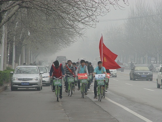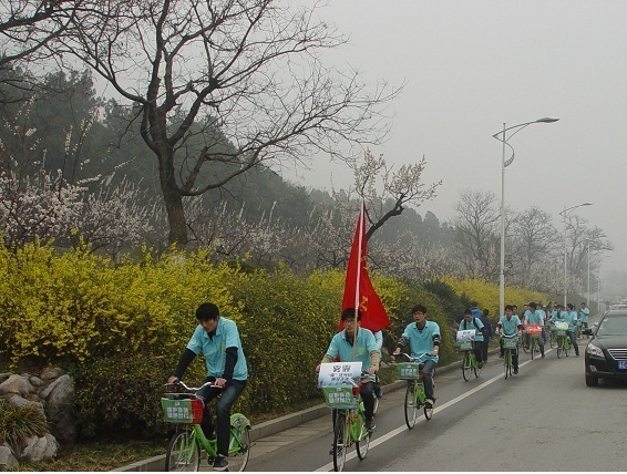 由于近一年中霧霾天氣頻繁出現(xiàn),環(huán)境污染比較嚴(yán)重,這也是近期兩會的熱點話題,中國礦業(yè)大學(xué)徐海學(xué)院建工系建環(huán)12-1團(tuán)支部為了積極的學(xué)習(xí)兩會精神,舉行了騎公共自行車宣傳“保護(hù)環(huán)境,綠色出行”的活動,提高人們保護(hù)環(huán)境的意識,鼓勵人們多騎自行車少開汽車,最終達(dá)到減少環(huán)境污染的目的。